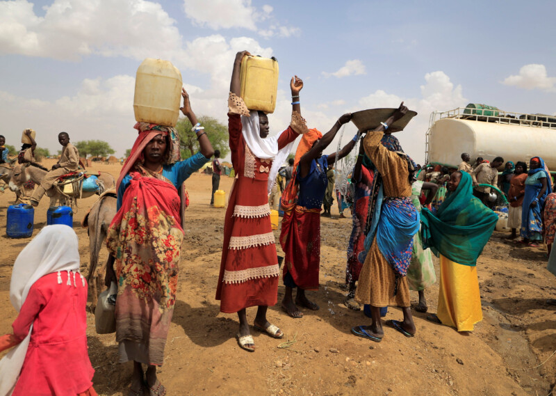 Sudanese refugee women who have fled the violence in Sudan’s Darfur region carry their jerrycans of water as they walk to their makeshift shelter near the border between Sudan and Chad in Koufroun, Chad May 10, 2023. REUTERS/Zohra Bensemra – RC2PV0AE81RZ
