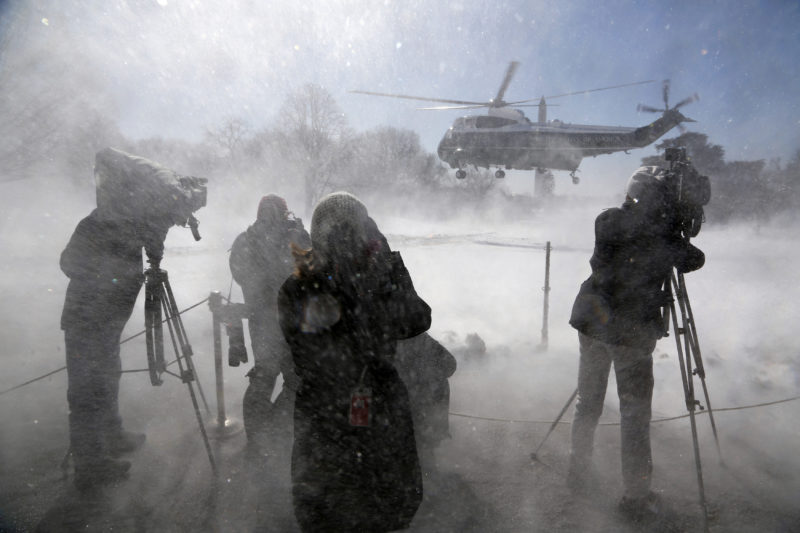 Reporters are whipped by blowing snow as former U.S. President Barack Obama departs from the White House in a helicopter, Washington, March 6, 2015. Jonathan Ernst/Reuters