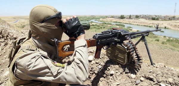 A member of Kurdish security forces patrols for ISIS militants on the outskirts of Mosul, Iraq. June 22, 2014. Azad Lashkari/Reuters/Corbis.