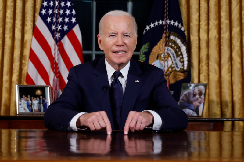 U.S. President Joe Biden delivers a prime-time address to the nation about his approaches to the conflict between Israel and Hamas from the Oval Office of the White House in Washington, October 19, 2023. Jonathan Ernst/Reuters