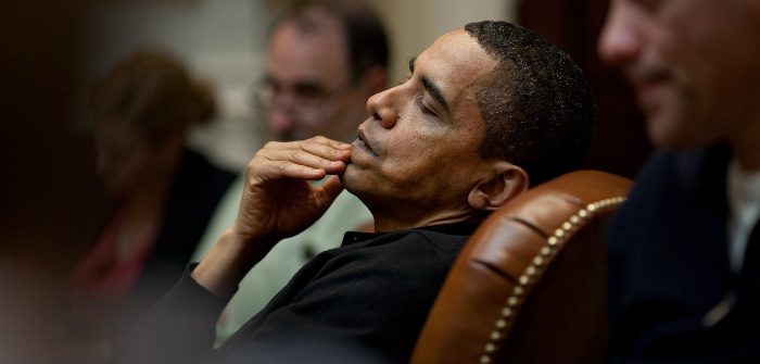 President Obama reflects during a meeting at the White House, March 15, 2009. The White House/Wikicommons