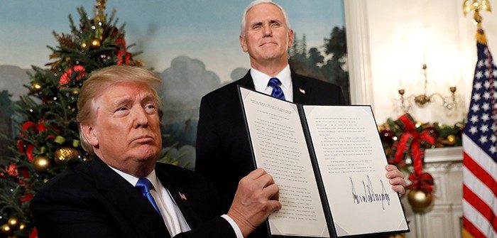 U.S. President Donald Trump holds up the proclamation that the United States recognizes Jerusalem as the capital of Israel and will move its embassy there, during an address from the White House in Washington DC, Dec 6, 2017. Kevin Lamarque/Reuters