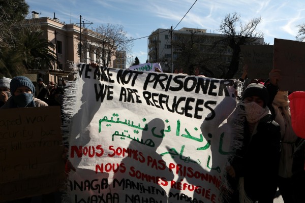 Refugees and migrants demonstrate in the city of Mytilene against living conditions in the Moria camp, on the island of Lesbos, Greece, January 30, 2020. Elias Marcou/Reuters.