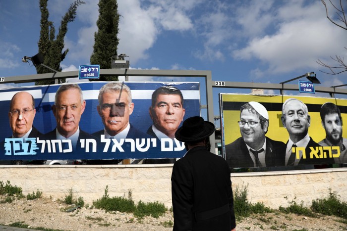 A man looks at two election campaign posters, one depicting leaders of the Blue and White Party and the other showing Israeli Prime Minister Benjamin Netanyahu with members of Israel’s far-right political party, Jewish Power, Jerusalem, March 27, 2019. Reuters/Ammar Awad