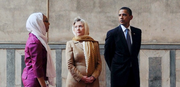 04 Jun 2009, Cairo, Egypt — epa01750812 US President Barack Obama (R) and US Secretary of State Hillary Clinton (C) listen to the guide tour (L) as they visit the Sultan Hassan Mosque, before giving his speech from Cairo University, during his visit to Cairo, Egypt on 04 June 2009. Obama is attempting to open a dialogue with the Muslim world by visiting Saudi Arabia and delivering a major speech in Cairo. The Sultan Hassan Mosque is considered stylistically the most compact and unified of all Cairo monuments. It is one of the masterpieces of Mamluk architecture. EPA/SAMEH REFAAT POOL — Image by © SAMEH REFAAT POOL/epa/Corbis