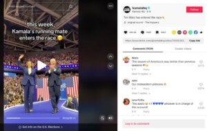 The official Kamala HQ account has outpaced Harris’ personal account, @KamalaHarris, as lead poster across platforms. Kamala HQ posts oscillate between polished interview clips and niche cultural references. It isn’t just popular albums, either; references run the gamut of any popular trend, especially from television. Shortly after Minnesota Governor Tim Walz was announced as Harris’ running mate, viewers saw a video of the pair overlaid with the massively popular reality show Love Island’s iconic narration: “This week, a hot new bombshell enters the villa.”