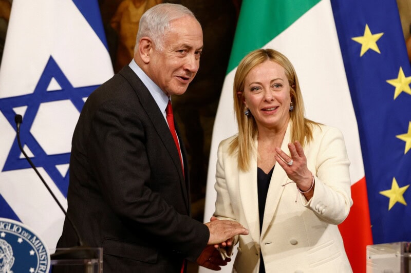 Italian Prime Minister Giorgia Meloni and Israeli Prime Minister Benjamin Netanyahu shake hands during a news conference after their meeting at Palazzo Chigi, in Rome, Italy, March 10, 2023. REUTERS/Guglielmo Mangiapane