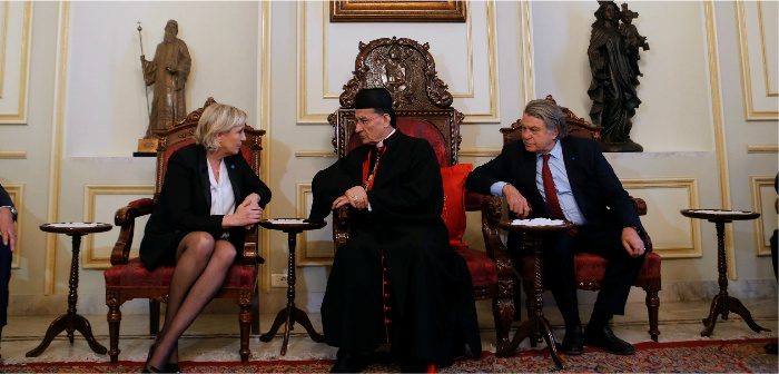 Marine Le Pen, France’s National Front (FN) leader, with Cardinal Bechara Boutros Rai of Lebanon, the Maronite Patriarch of Antioch and the Whole Levant, and French deputy Gilbert Collard in Bkerke, north of Beirut, Feb. 21, 2017. Mohamed Azakir/Reuters